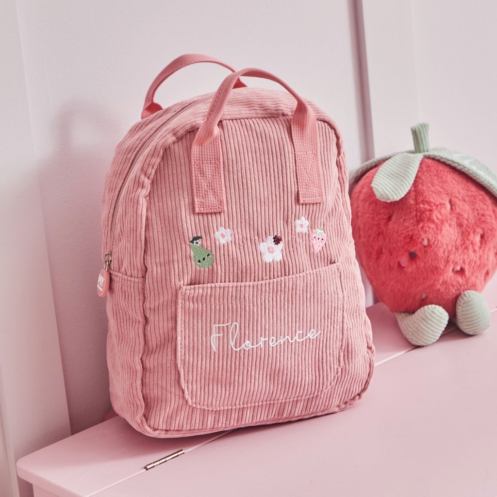 Perfectly sized for toddlers and preschoolers, this pastel pink cord backpack is ideal for nursery, park trips, or weekends away. Lightweight yet sturdy, it’s padded where it needs to be (hello, comfy straps!) and has enough room for snacks, toys, or a change of clothes without feeling bulky. The custom name embroidery adds a premium feel, and the chunky, thick fabric means it’s as practical as it is pretty.